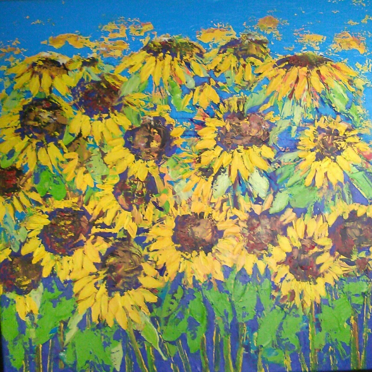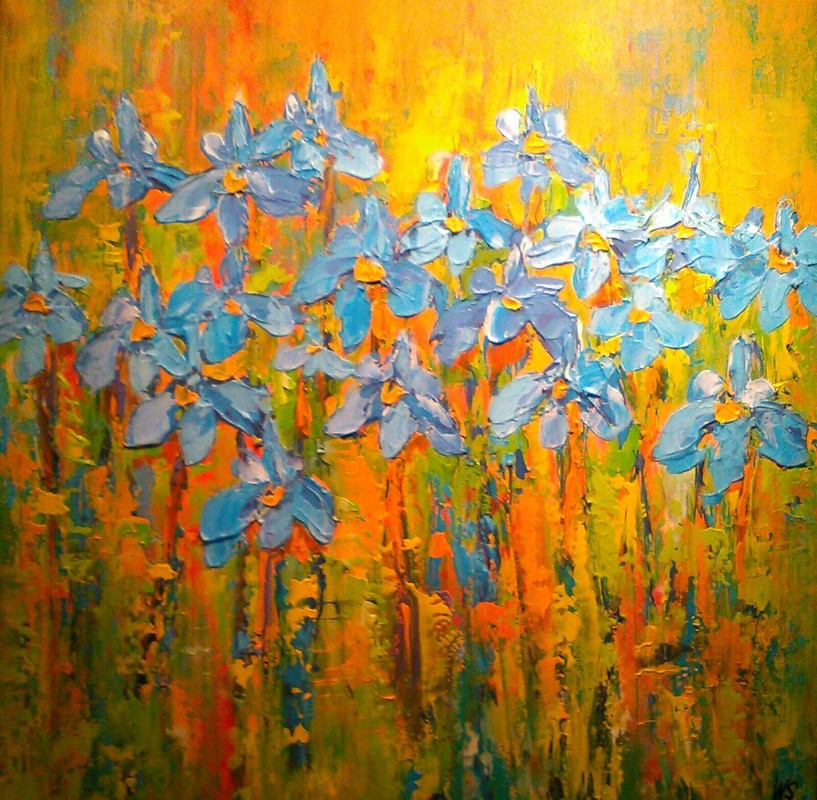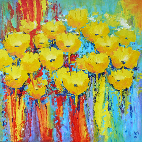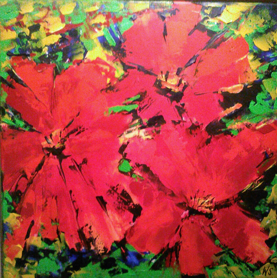 Wiel maakt kleurrijke figuratieve schilderijen in acryl met bloemen als hoofdmotief.